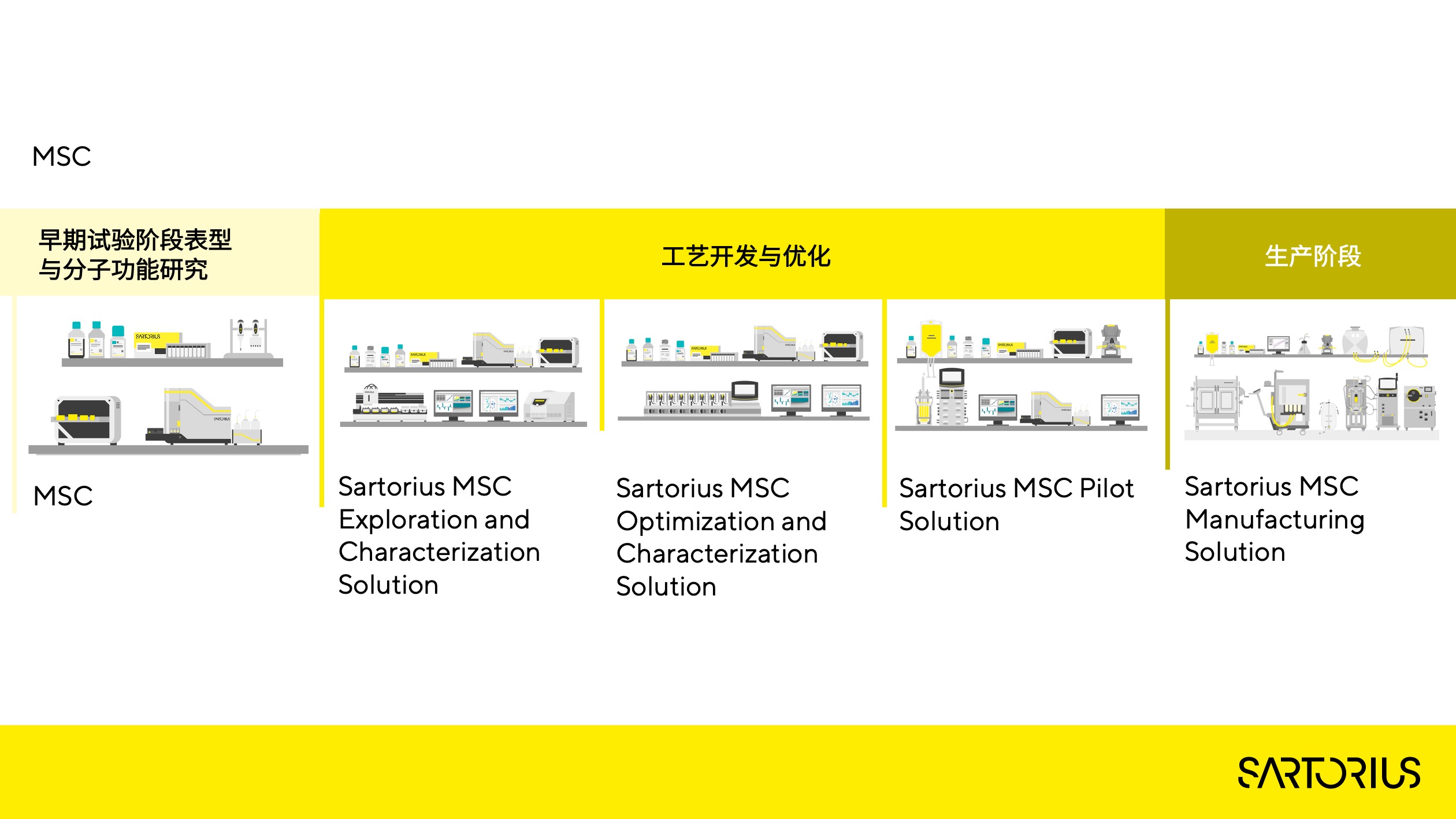 MSC的全工藝流程可以從實(shí)驗(yàn)室階段開始的早期分子靶點(diǎn)功能和表型表征研究,進(jìn)入到小試階段的工藝開發(fā)與優(yōu)化,最后進(jìn)入產(chǎn)業(yè)化生產(chǎn)階段。對于每一個(gè)階段的任務(wù),賽多利斯都有對應(yīng)的解決方案,加速M(fèi)SC產(chǎn)品的上市進(jìn)程。