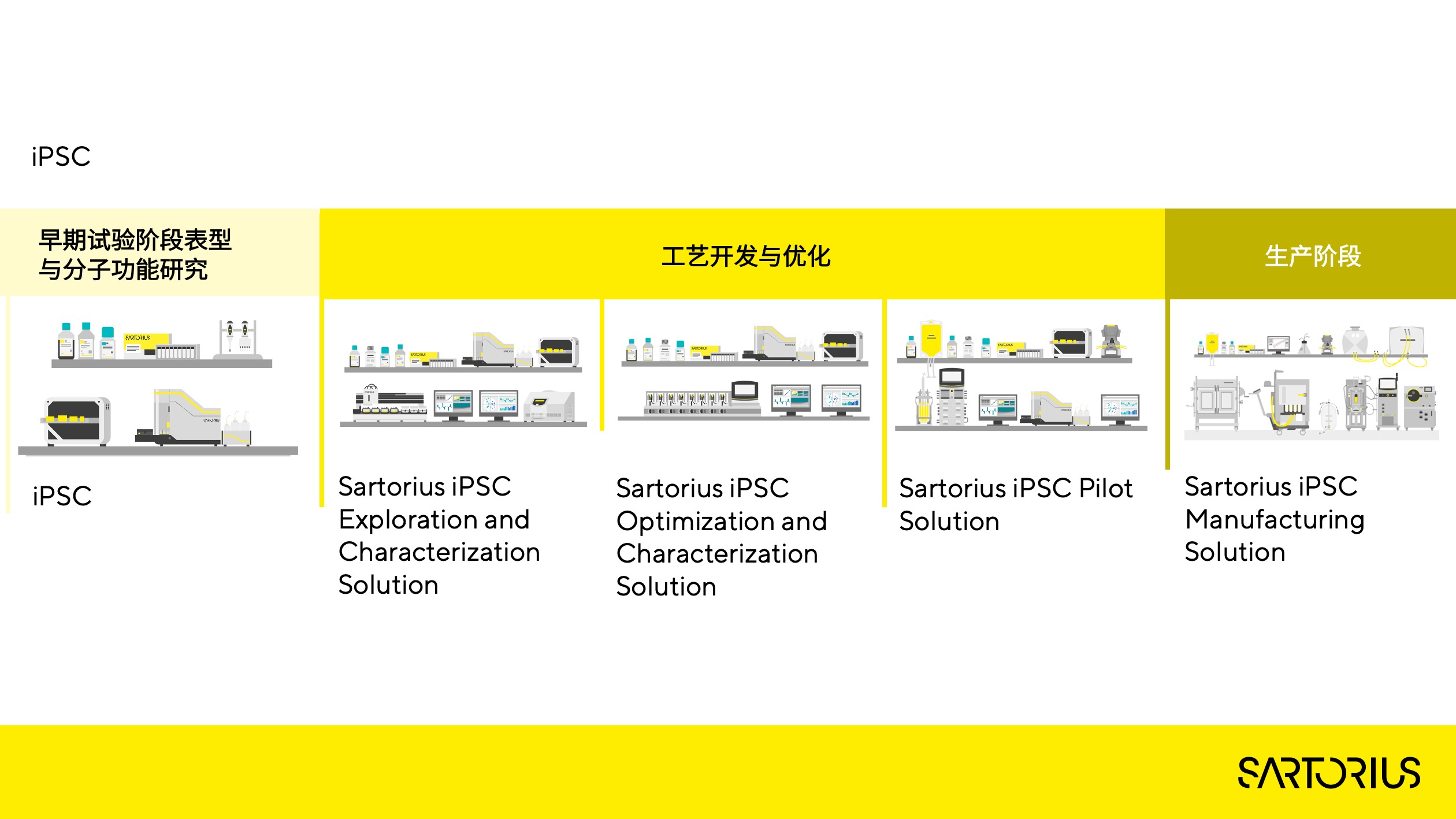 iPSC的全工藝流程可以從實(shí)驗(yàn)室階段開始的早期分子靶點(diǎn)功能和表型表征研究,進(jìn)入到小試階段的工藝開發(fā)與優(yōu)化,最后進(jìn)入產(chǎn)業(yè)化生產(chǎn)階段。對于每一個(gè)階段的任務(wù),賽多利斯都有對應(yīng)的解決方案,加速iPSC產(chǎn)品的上市進(jìn)程。